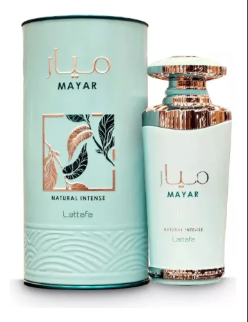 Mayar Natural Intense de Lattafa Perfumes es una fragancia de la familia olfativa para Mujeres. Mayar Natural Intense se lanzó en 2024. Las Notas de Salida son higo, Mandarina verde, Agua de coco y melón; las Notas de Corazón son nenúfar (lirio de agua), jazmín y flor de loto; las Notas de Fondo son vainilla, sándalo, ambroxan y almizcle.